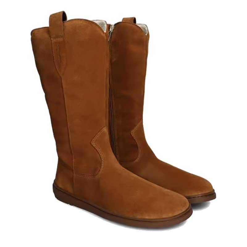 Crafted from super-soft suede leather, these boots feature a tall shaft and practical side pull loops, staying true to traditional cowboy boot styling while offering the flexibility and comfort expected from barefoot shoes. The warm cognac colour and statement silhouette add a distinctive Western-inspired touch to everyday outfits.